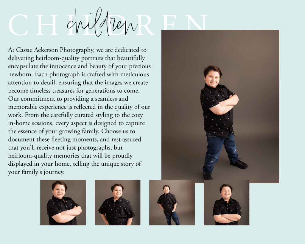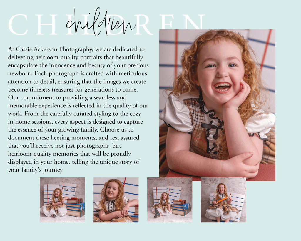 Whether you want to capture your child’s milestones, create family portraits, or celebrate a special occasion, Cassie Ackerson Photography is here to provide you with exceptional child portrait photography services. Take a look at my portfolio and read testimonials from satisfied clients to see the joy and happiness we’ve captured in the faces of countless children.