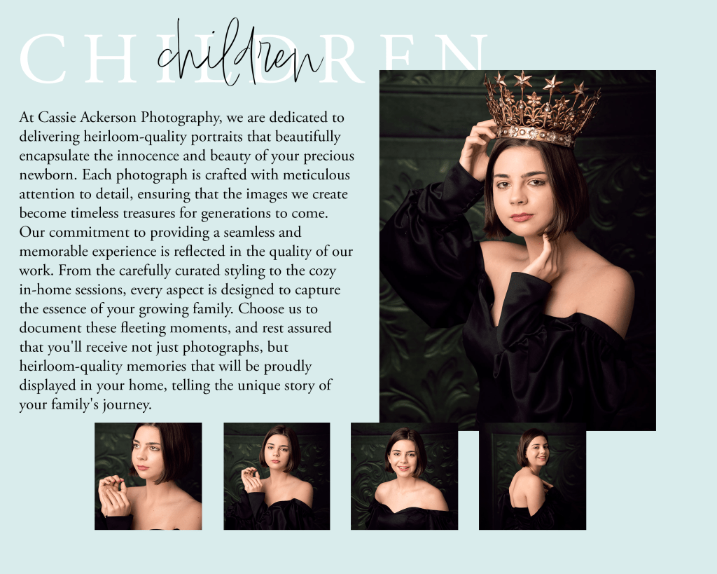 I am passionate about capturing the essence and wonder of childhood through beautiful and timeless portraits of your children. With expertise in child photography, I aim to create images that you and your family will cherish for a lifetime.